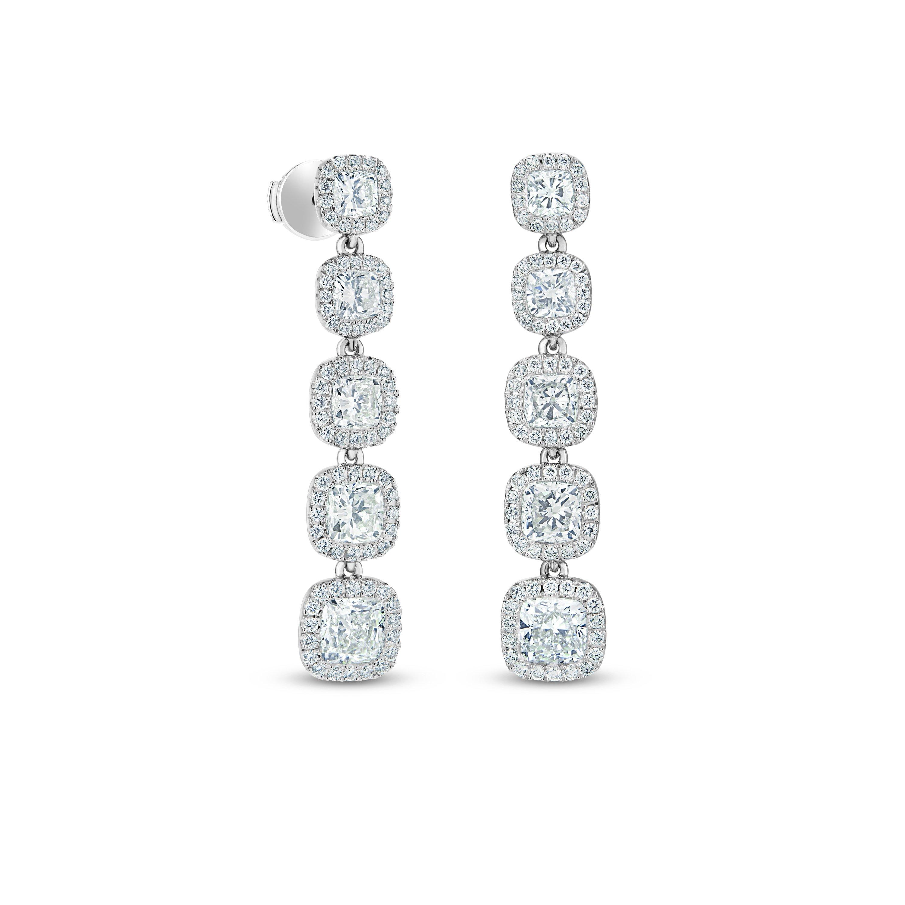 Our 18K white gold and diamond drop earrings are delicately edged by micropavé diamonds, an iconic De Beers motif we named Aura. Ensuring each is neatly embraced, the hand-set micropavé is bespoke for each of the cushion-cut diamonds. The series of five subtly graduate in size to frame the face. This cut is universally renowned for its Fire, the way light disperses in a diamond, thanks to a higher number of facets than other cuts. As such, this classic shape is symbolic of finding the light in every moment.