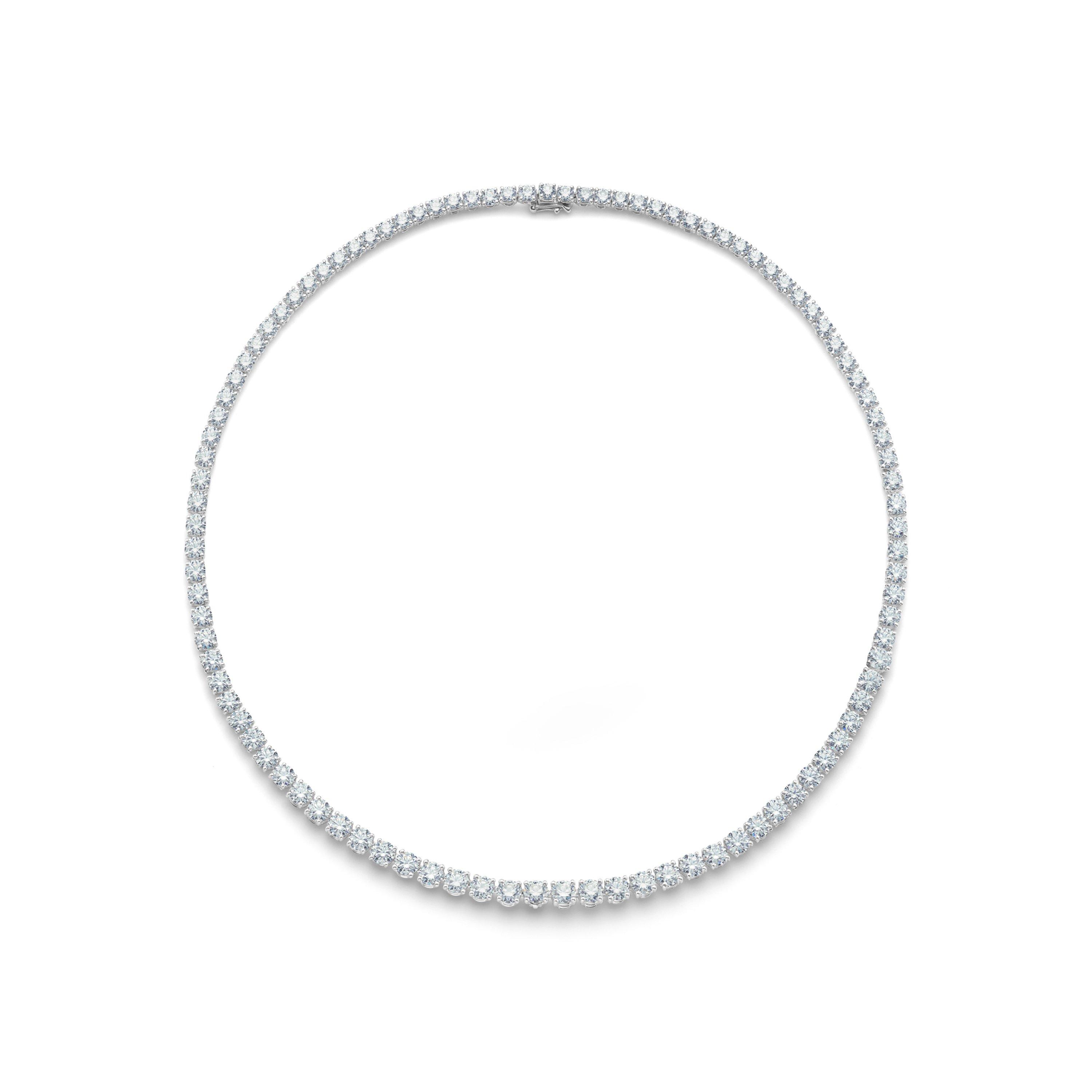 A single row of expertly matched round brilliant diamonds comprises this understated, exceptional diamond line necklace, their size gently graduated. Each diamond is prong-set in 18K white gold, elevated for maximum light play, enhancing their innate Brilliance. Elegant and minimal, it would wear beautifully alone, or alongside a diamond line bracelet from the same collection. Each diamond within this necklace has been responsibly sourced, selected by eye and hand-aligned by De Beers' team of experts.