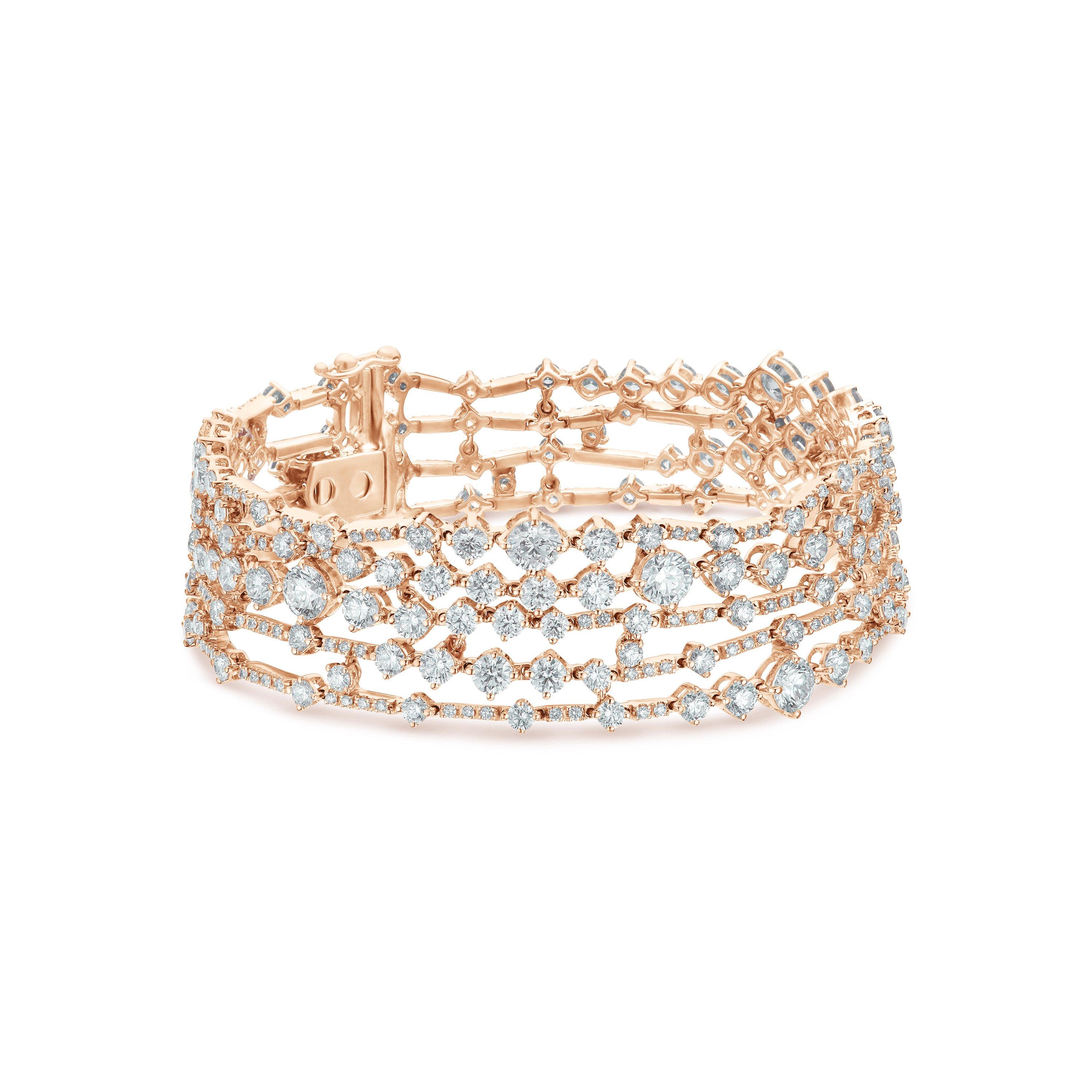 这款钻石手链的工艺非凡,将珍贵稀有的钻石之美淋漓尽致地呈现出来。 五排18K玫瑰金密镶钻石环绕手腕,每一排都额外点缀着爪镶圆形明亮式切割钻石,如同一个个音符在乐谱中翩翩起舞。这款手链属于Arpeggia系列,其设计灵感源自贝多芬为其挚爱所创作的传奇奏鸣曲。 戴比尔斯匠人团队拥有传承130多年的钻石精湛技艺,践行行业道德,对这款珠宝中的每颗钻石都做了精心甄选和镶嵌。