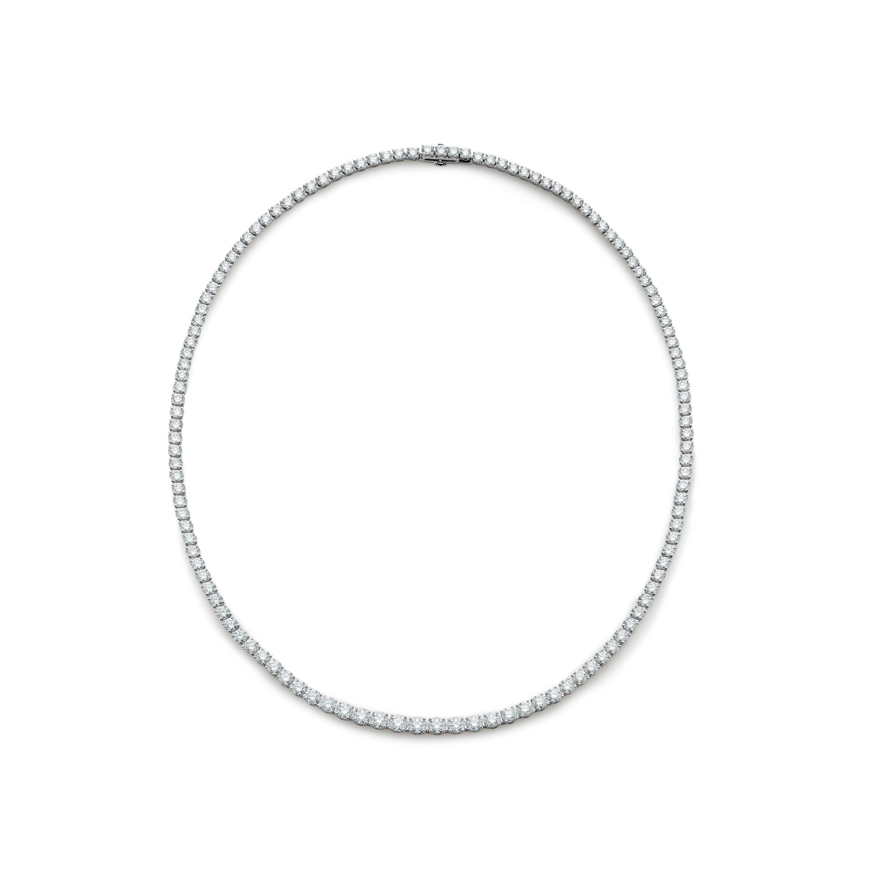这款钻石项链时尚典雅,流畅简洁,极致呈现钻石的自然之美。 单排渐变式圆形明亮式切割钻石缀饰其中,每颗钻石皆遵循道德规程采购,由戴比尔斯钻石专家以专业眼光精心挑选、细致排列镶嵌,呈现平衡和谐之美。 钻石以四爪镶嵌工艺镶于 18K 白金之上,提升了钻石的光线折射能力,最大程度彰显其璀璨亮光。