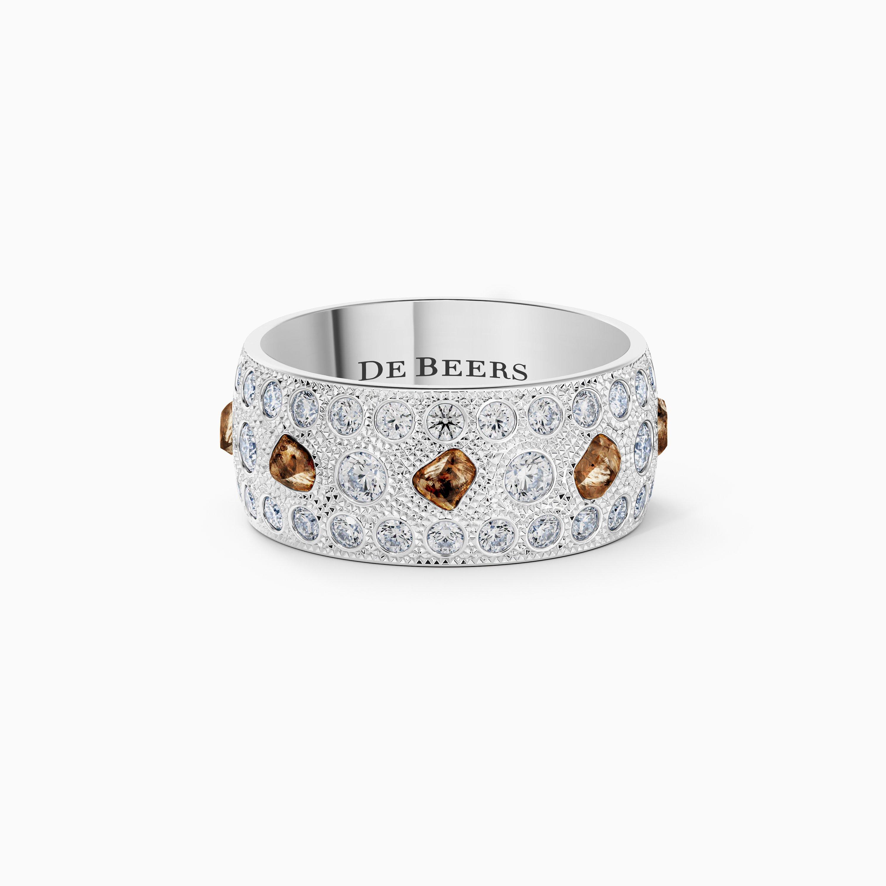 这款 18K白金戒指宽 8.0 毫米,镶嵌 70 颗具有独特个性的美钻,钻石总重约 1.82 克拉。天然原钻与圆形明亮式切割和玫瑰式切割抛光钻石交相辉映,令这件大胆醒目的珠宝生机勃勃、熠熠生辉。